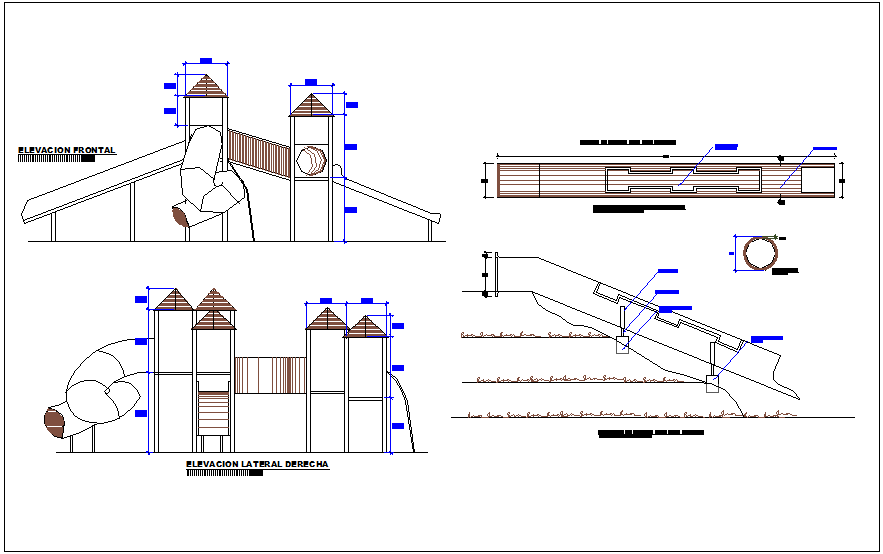 Multiple use plying game area view different elevation with section detail dwg file in elevation with view of floor view,cone shaped view on top with different texture,tube