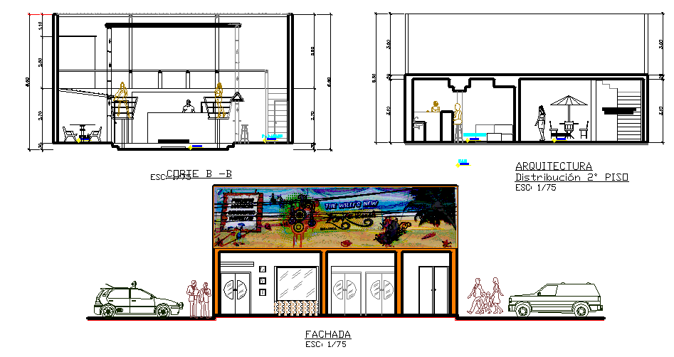 Restaurant elevation layout plan dwg file, front elevation details are shown with human figure details, tabletop view, bar etc