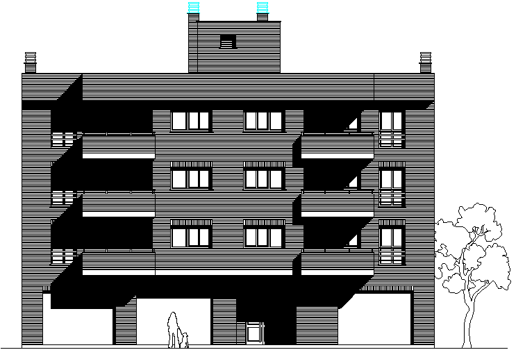 Front elevation house detail dwg file, with landscaping detail with tree detail, balcony reeling detail, etc.