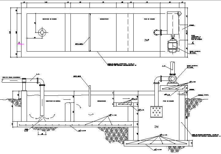 Treatment plant to take off sand detail dwg file, plan and section detail, dimension detail, naming detail, etc.