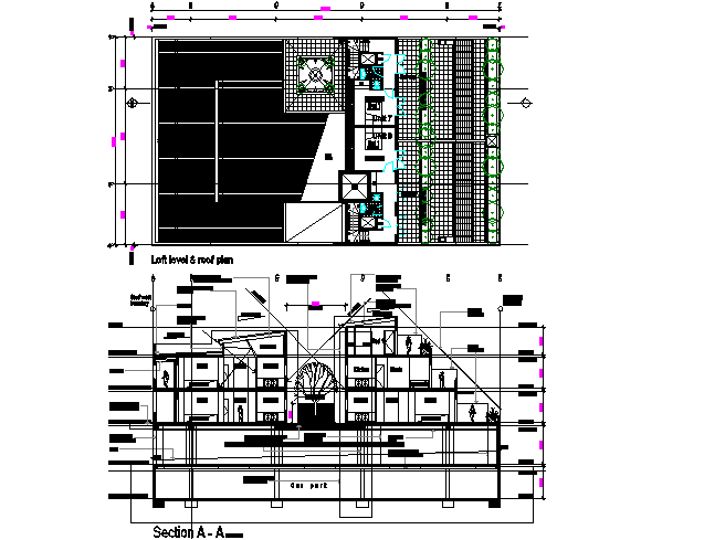 Section and roof plan house detail dwg file, dimension detail, naming detail, section A-A’ detail, gazebo detail, etc.