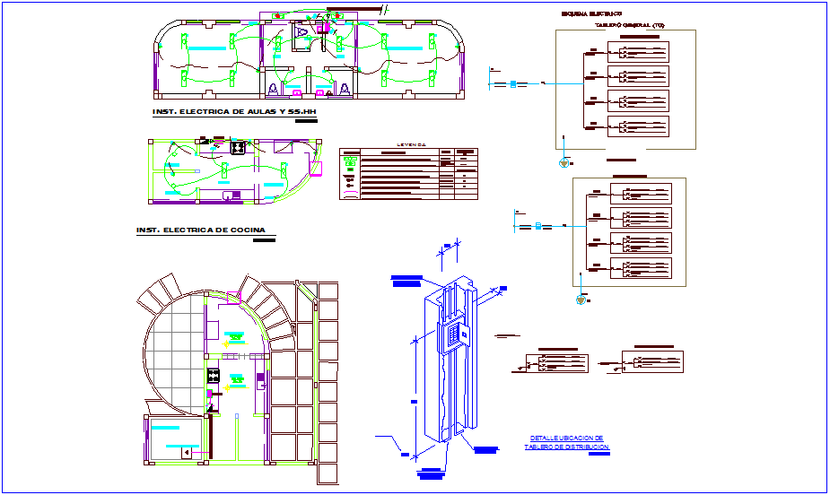 Electrical installation plan of classroom with its kitchen,electrical legend,diagram with isometric view of switchboard dwg file