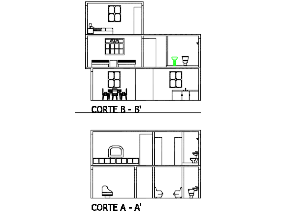 Section house detail dwg file, including section A-A’ detail, section B-B’ detail, furniture detail with table, chair, door and chair detail, etc.