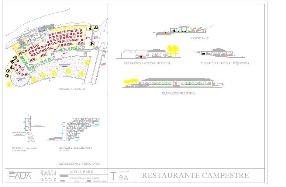 This Restaurant Layout Design DWG presents a detailed architectural plan of a countryside-style restaurant with complete floor plan, section, and elevation drawings. The layout includes dining areas, service zones, outdoor seating arrangements, restrooms, and circulation paths for guests and staff. The plan highlights landscaping features, site context, and contour integration suitable for natural terrain-based restaurant projects.