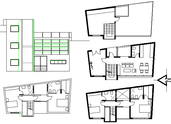 Artists house plan detail dwg file, with elevation and plan detail, north direction detail, front elevation detail, right elevation detail, back elevation detail, etc.