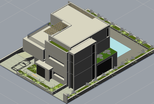 3 D modern house detail dwg file, including landscaping detail in plant and tree detail, swimming pool detail, etc.