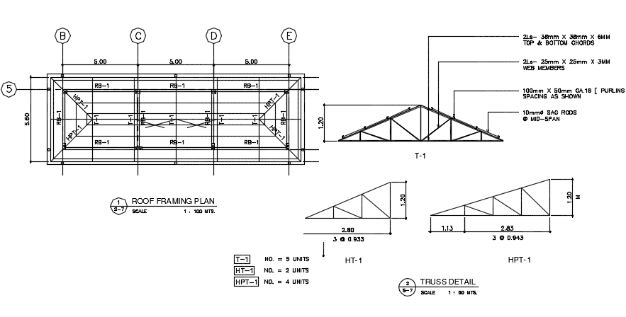Framing roof plan detail dwg file, with truss detail, naming detail, dimension detail, scale 1:100 detail, etc.