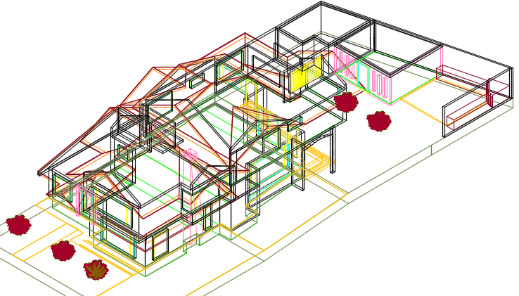 3 D residential house detail dwg file, including landscaping detail in plant and tree detail, roof detail, etc.