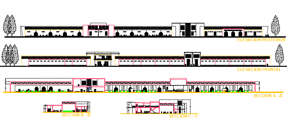 Elevation and section detail dwg file, including front elevation detail, back elevation detail, section A-A’ detail, section B-B’ detail, section C-C’ detail, etc.