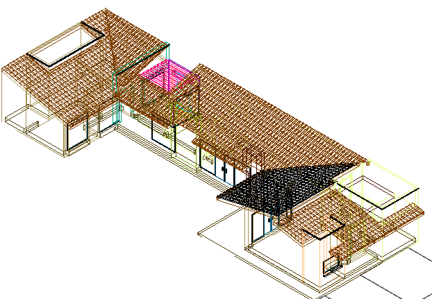 3 D house plan detail dwg file, with roof elevation detail, chimney detail, etc.