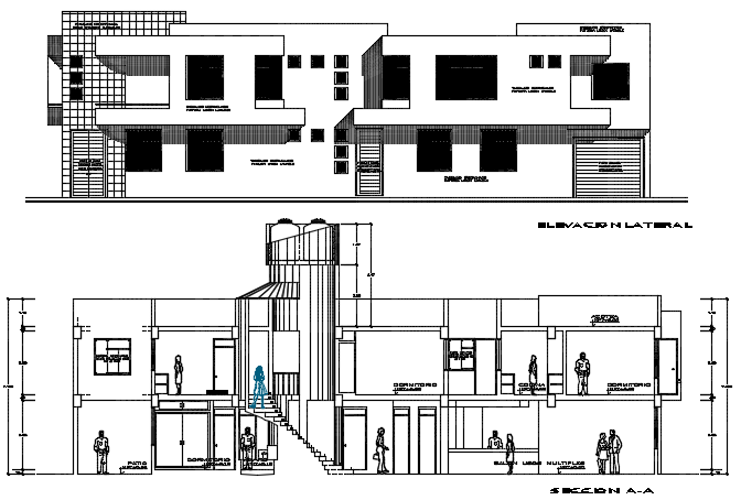 Elevation and section Apartment building plan detail dwg file, with front elevation plan detail, section A-A’ detail, etc.