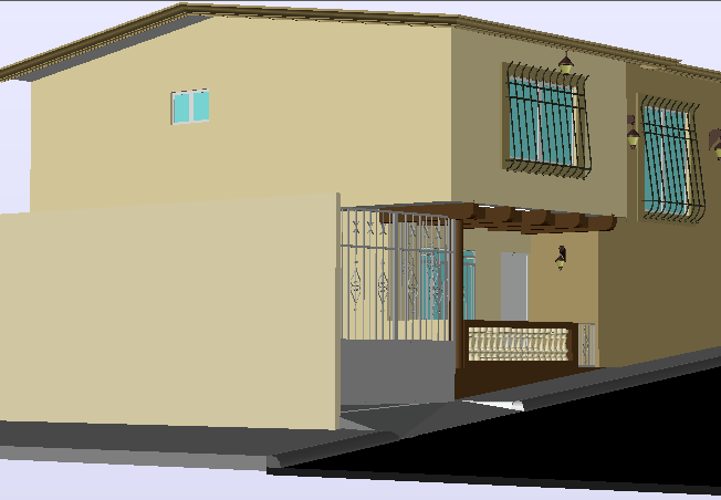 3 D duplex house detail dwg file, with front elevation view detail, main gate detail, balcony reeling detail, etc.