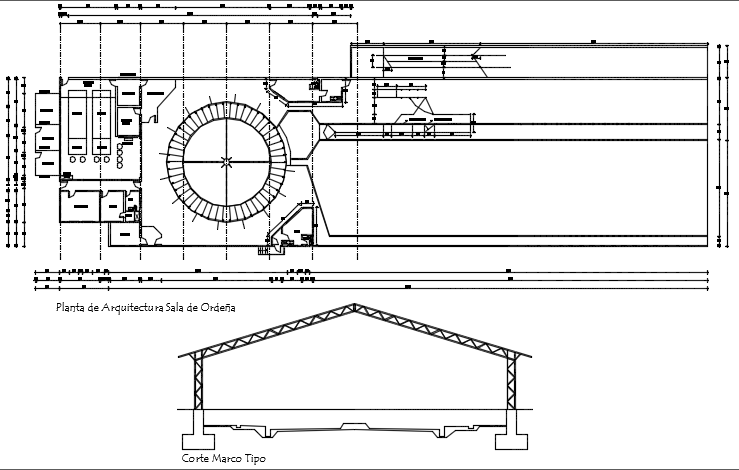 Milking room plan and section detail dwg file, with furniture detail with door and window detail, steel framing detail, circle detail, etc.