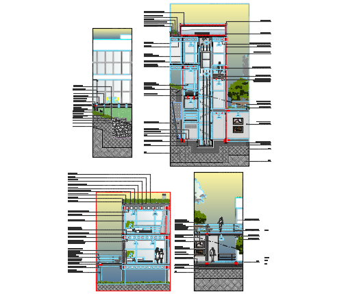Wall section detail dwg file, with landscaping detail with tree and plant detail, naming detail, dimension detail, etc.