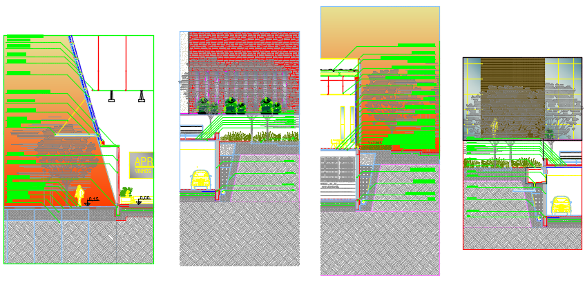 Section wall plan detail dwg file, including car parking detail, naming detail, landscaping detail with tree and plant detail, etc.