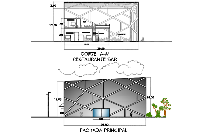 Elevation and section rest bar project plan detail dwg file, including front elevation detail, section A-A’ detail, dimension detail, naming detail, etc.