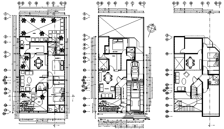 Split level house plan detail dwg file, including north direction detail, center line plan detail, landscaping detail with tree and plant detail, etc.