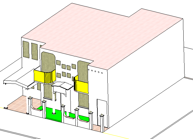 Housing 3 D plan detail dwg file, including front elevation view detail, veranda detail, balcony detail, etc.