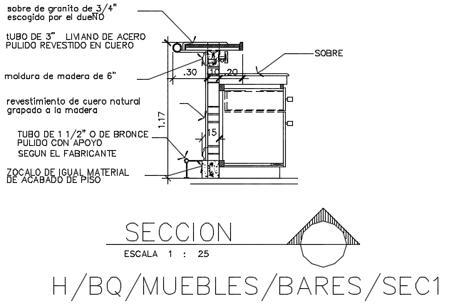Bar furniture section detail dwg file, including scale 1:25 detail, dimension detail, naming detail, etc.