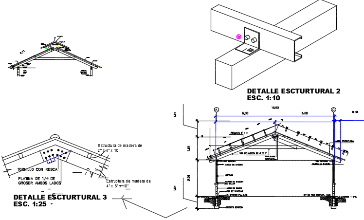 Detailing structural roof dwg file, with king post detail, bolt nut detail, scale 1:10 detail, reinforcement detail, dimension detail, naming detail, etc.