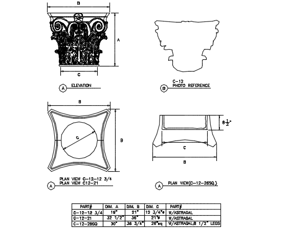 Corinthian capitals plan detail dwg file, with plan, elevation and section detail, dimension detail, naming detail, etc.