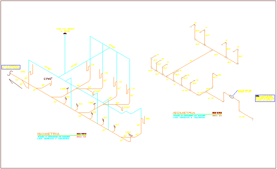 Single sanitary water line isometric view with black and white water line system for classroom dwg file in isometric view with single line water line view with its jint and symbolic view in both system with necessary dimension.
