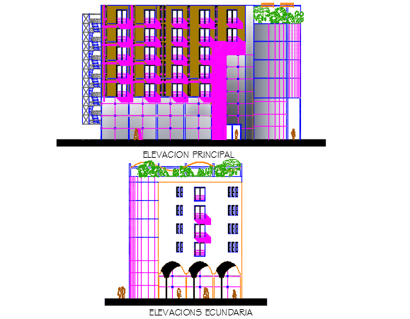 Elevation hotel detail dwg file, including front elevation view detail, side elevation plan detail, landscaping plan detail with plant detail, etc.