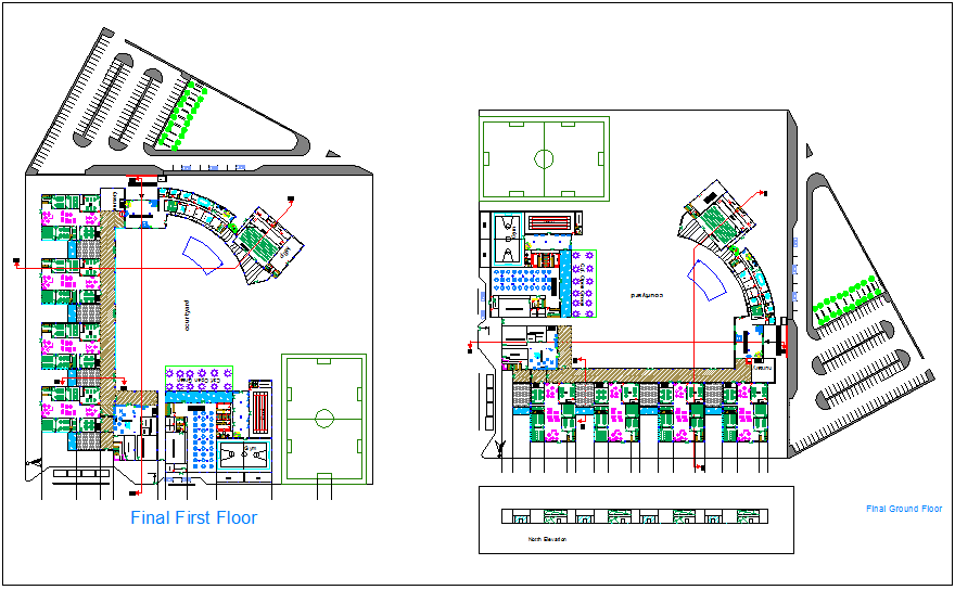 Secondary school for women ground and first floor plan dwg file in ground floor plan with view of area view and view of garden,road view,Jim,reception,prayer room,