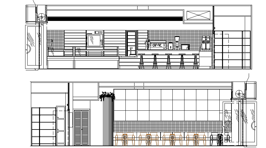 Sectional detail and elevation of a cafe dwg file,furniture details are shown, dining arrangement , all elevation detail is shown