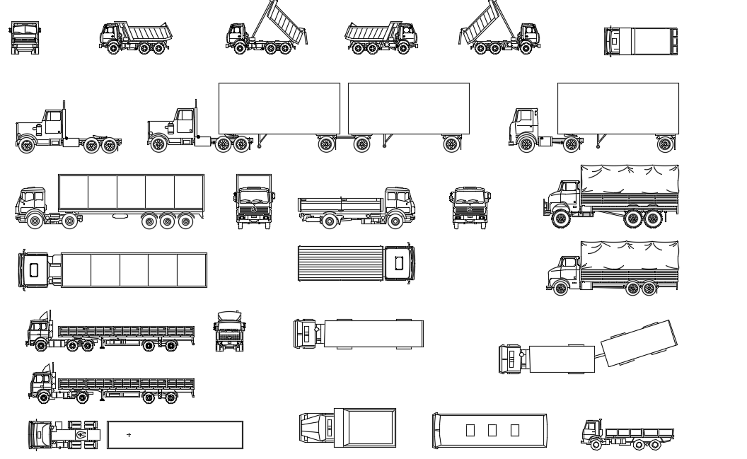 Trucks set dwg file.Trucks. Concrete pump trucks, Tank Truck, Dump Truck, in plan, front and elevation view in AutoCAD format.
