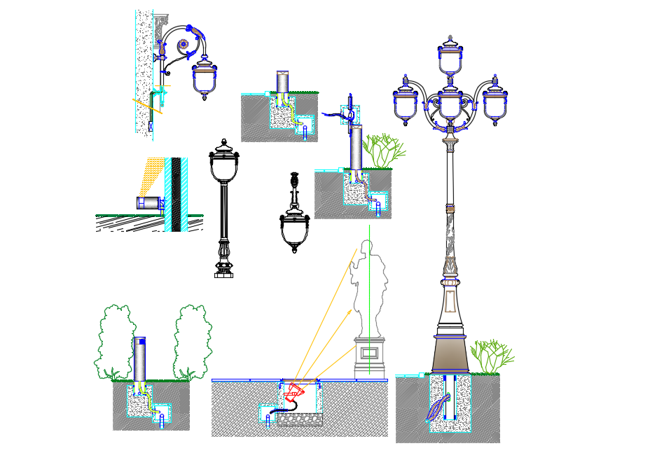 Urban lighting design dwg file.Outdoor lighting, street and roadway lights poles; outdoors, lamps, street light, light, metal, electric light, lantern, lighting equipment, Luminaire in AutoCAD format.