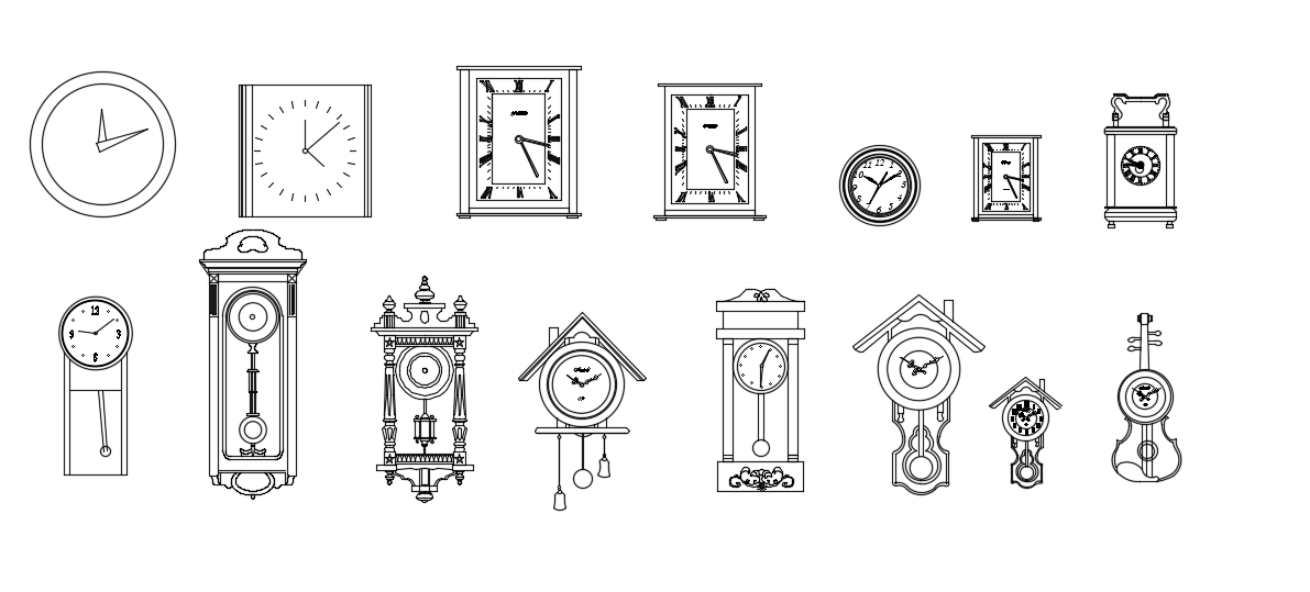 Wall clocks dwg file. Antique, Decorative and Modern Wall Clocks in AutoCAD format.