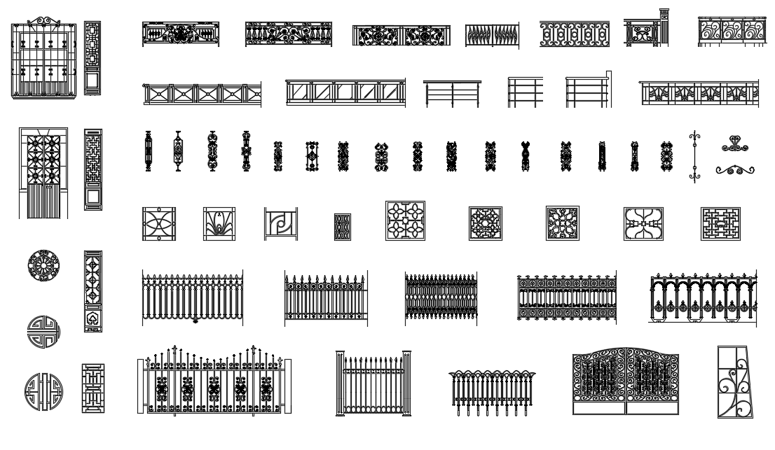 Wrought iron fences dwg file. various designs, drawing labels, details, and other text information extracted from the CAD file