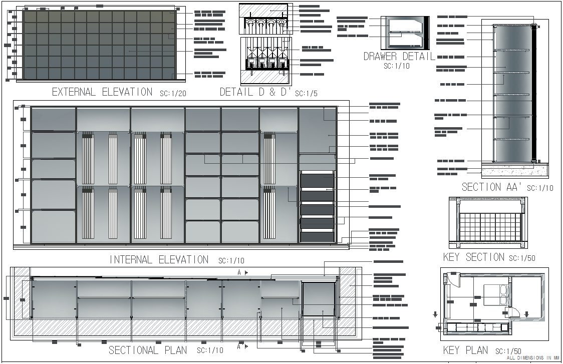 This AutoCAD DWG file provides a complete wardrobe design detail, including sectional plans, internal and external elevations, and precise drawer joinery. The layout shows modular storage units with multiple shelves, hanging sections, and sliding doors designed for efficient space utilization. The file includes detailed sections (SC: 1/10) and drawer construction detail (SC: 1/5), making it ideal for residential and interior design projects.