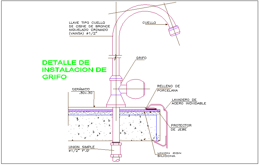 Round neck shaped designer tap with its installation view for laboratory of collage dwg file in installation view of round neck shaped designer tap view with water flow line in