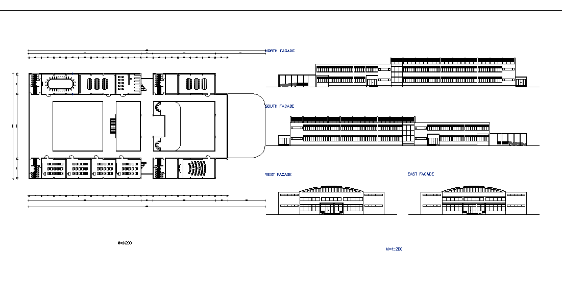 Building layout plan with elevation and section. North ,south, east and west facade detail ,furniture detail, dimension detail, centre courtyard and other details.
