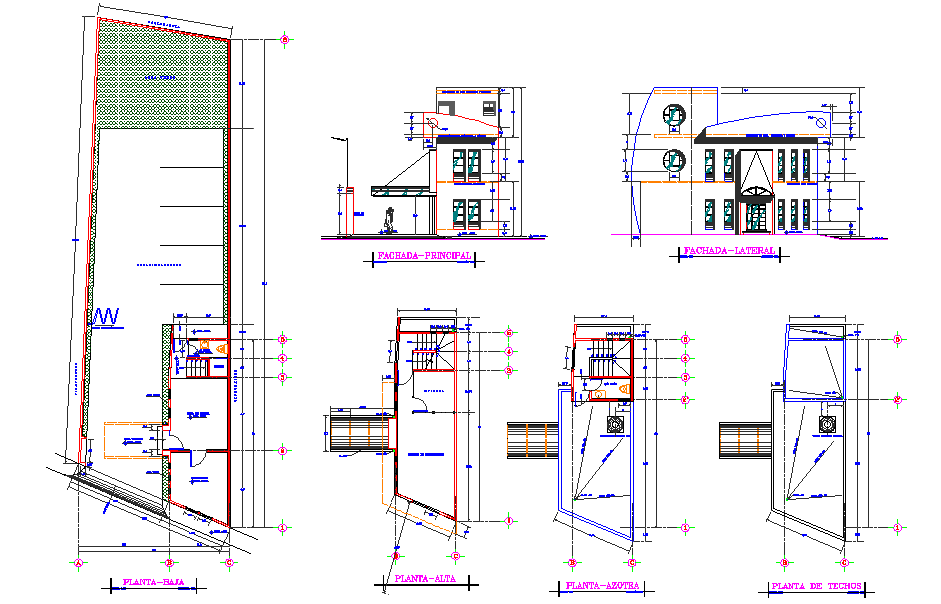 The plan also highlights roof projections, beam layout, and structural slab detailing for practical construction execution. Elevation drawings illustrate the building façade and lateral view with window placement and ventilation strategy. The total area includes landscaped zones and a designated green area for aesthetics and functionality. This DWG file is ideal for architects, interior designers, civil engineers, and builders creating modern dental clinics or small medical facilities. The layout demonstrates optimal use of space with an efficient flow between patient, staff, and treatment zones. This Dental Clinic AutoCAD DWG design features a complete architectural layout with ground, upper, and roof plans designed at a scale of 1:75. The file includes clear labeling for areas such as the consultation room, waiting area, pharmacy, half bath, storage, and parking section. Detailed annotations indicate elevation levels, septic tank position, water system, and ramp access, ensuring compliance with healthcare design standards.