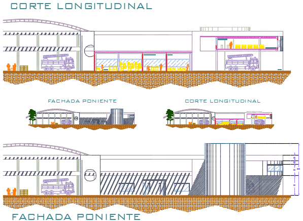 Section and elevation fire station plan detail dwg file, including dimension detail, naming detail, front elevation detail, back elevation detail, etc.