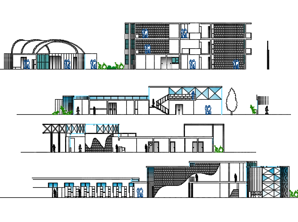 Elevation and section detail dwg file, with landscaping detail in tree and plant detail, front elevation detail, right elevation detail, section detail, etc.