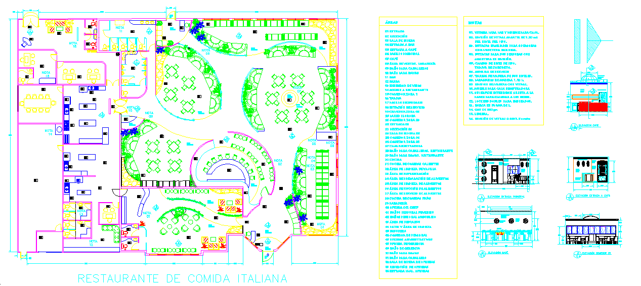 The drawing further features detailed elevation views of interior counters, wall panels, bar units, decorative fronts, and food display sections. Component drawings show the structure of the service counter, entrance structure, ventilation component, and supporting kitchen equipment layout. The DWG uses clean linework, color-coded layers, and organized detailing to help architects, interior designers, and builders understand the exact arrangement of seating modules and functional zones. This plan serves as a complete reference for modern restaurant planning, interior execution, furniture layout development, and dining space optimization.