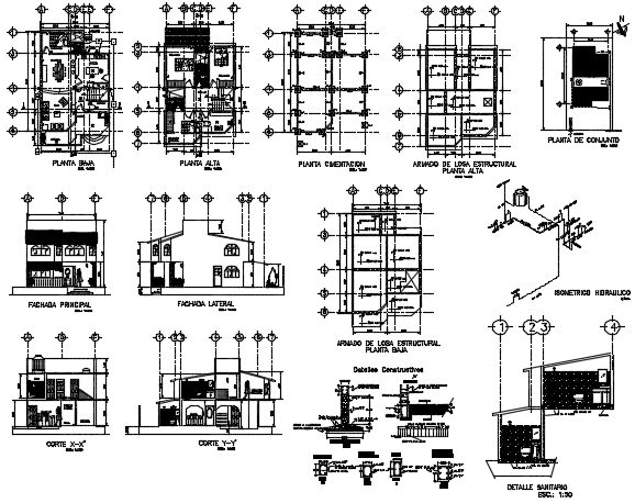 Working house plan detail dwg file, with center line plan detail, front elevation detail, back elevation detail, section X-X’ detail, dimension detail, naming detail, etc.