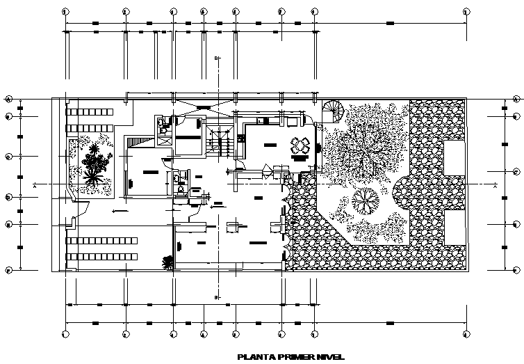 House planning detail dwg file, including center line plan detail, dimension detail, naming detail, tree and plant detail, etc.