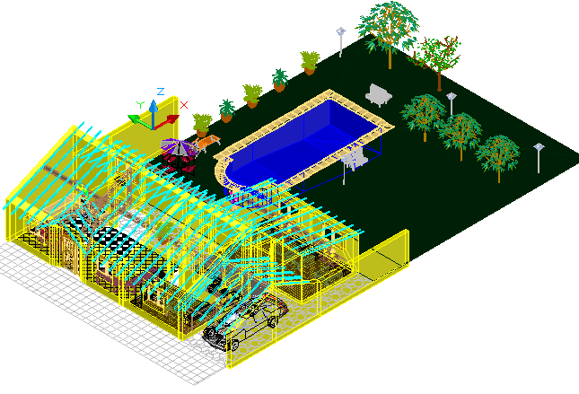 3 D house plan detail dwg file, with swimming pool detail, roof plan detail, street light detail, car parking detail, landscaping detail with tree and plant detail, etc.