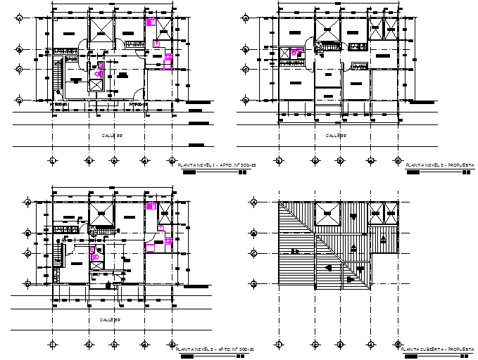 Plants and facades of multi family housing detail dwg file, with center line plan detail, dimension plan detail, naming detail, etc.
