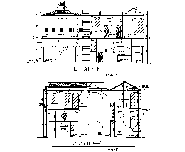 Section house plan detail dwg file, including section A-A’ detail, section B-B’ detail, dimension detail, naming detail, etc.