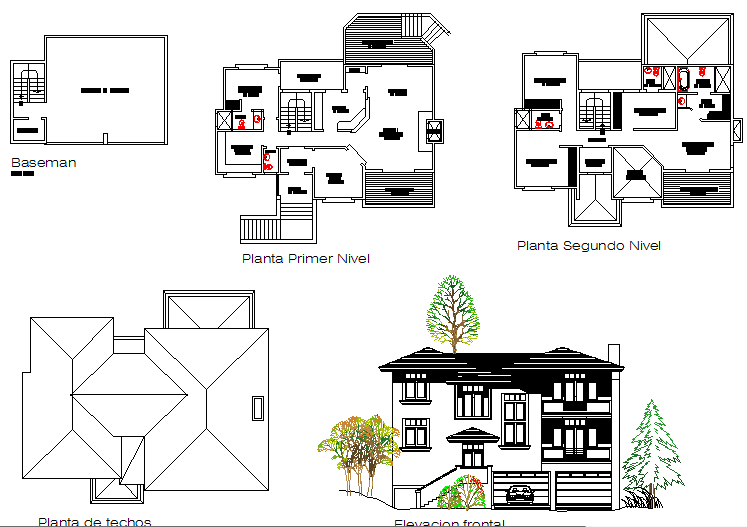 Project residence colonial type plan detail dwg file, with landscaping detail in tree and plant detail, cut out detail, basement floor to terrace floor plan detail, etc.