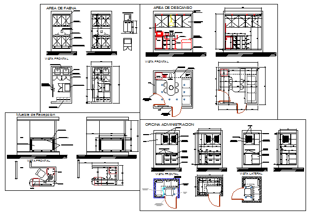 Furniture detail drawing of Office with rest area detail drawing section and pantry area detail drawing section and administration area detail drawing with section, reception area detail drawing section design drawing in this auto cad file.