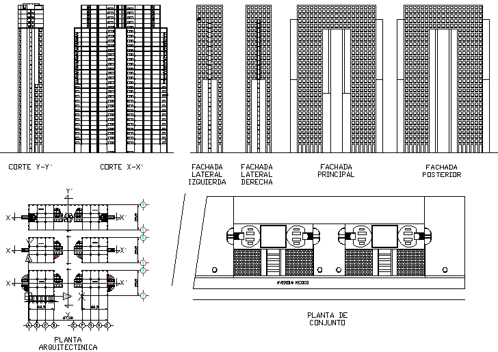 High rise Building detail dwg file, with plan, elevation and section detail, front elevation detail, side elevation detail, left elevation detail, back elevation detail, section X-X’ detail, section Y-Y’ detail, etc.