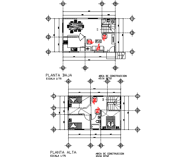 House 84 x 542 plan detail dwg file, including center line plan detail, dimension detail, stair detail, scale 1:75 detail, etc.