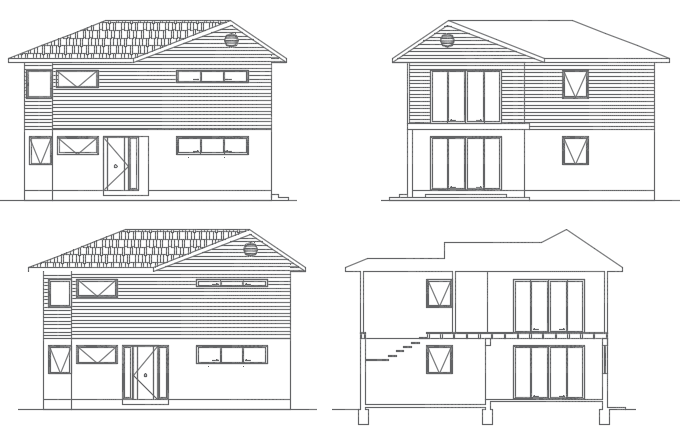 Elevation house detail dwg file, with front elevation detail, left elevation detail, right elevation detail, back elevation detail, etc.
